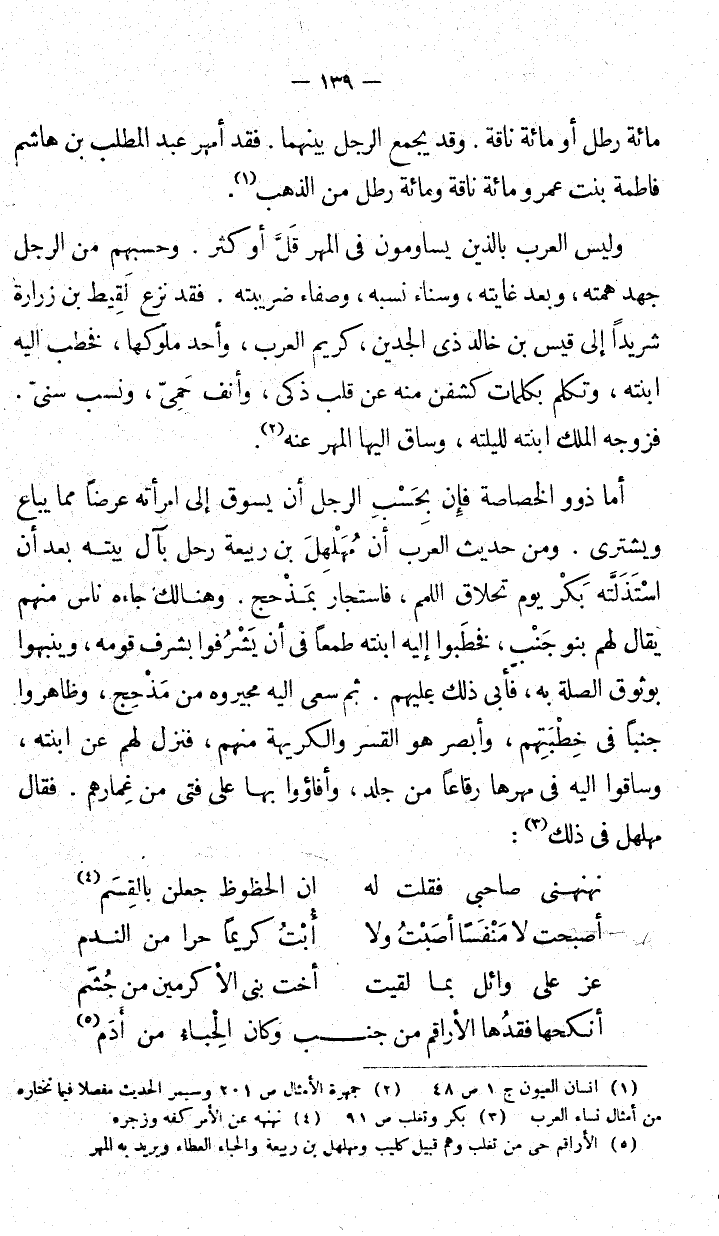 أما ذوو الخصاصة فأن بِحَسْبِ الرجل أن يسوق إلى امرأته مما يباع ويشترى. ومن حديث العرب أن مُهلهِلَ بن ربيعة رحل بآل بيته بعد أ، اْستَذَلَّتْهُ بَكْريم يوم تحلاق اللمم، فاستجار بَمذْحج. وهنالك جاءه ناس منهم يقال لهم بنو جَنْبٍ فخطَبوا إليه ابنته طمعاً في أن يَشْرُفوا بشرف قومه، وينبهوا بوثوق الصلة به، فأبى ذلك عليهم. ثم سعى إليه مجيروه من مَذْحِج، وظاهروا جنباً في خْطَبتهم وأبصر هو