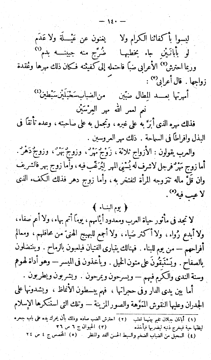 لا تجد في مأثورة حياة العرب ومعدود أيامهم، يوماً أتم بهاء، ولا أعم صفاء. ولا أبدع رُواء ولا أكثر ضياء ولا أجمع للبهيج الهني من محالفهم، ومعالم أفراحهم من يوم البناء. فهنالك يتبارى الفتيان فيلعبون بالرماح. وينتضلون بالصفاح ويَستَبِقون على متون الخيل. ويأخذون في الميسر - وهو أداة لهوهم وسنة الندى