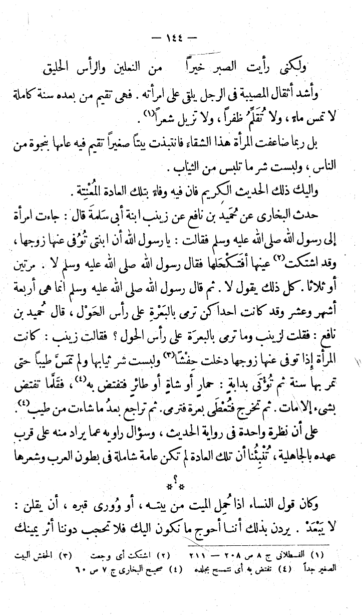 وأشد القتال أثقال المصيبة في الرجل يلقي امرأته. فهي تقيم من بعده سنة كاملة لا تمس ماءً، ولا تُقَلَّمُ ظفراً، ولا تزيل شعراً