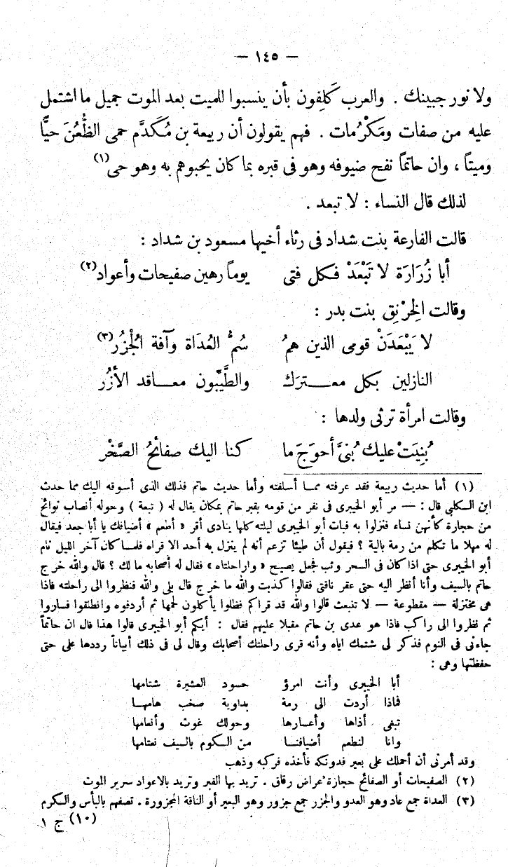 ولا نور جبينك. والعرب كَلِفون بأن ينسبوا للميت بعد الموت جميل ما اشتمل عليه من صفات ومَكرُمات. فهم يقولون إن ربيعة بن مُكَدَّوم حمى الظُّعُنَ حيَّا وميتاً. وإن حاتماً تفح ضيوفه وهو في قبره بما كان يحبوهم به وهو حي.