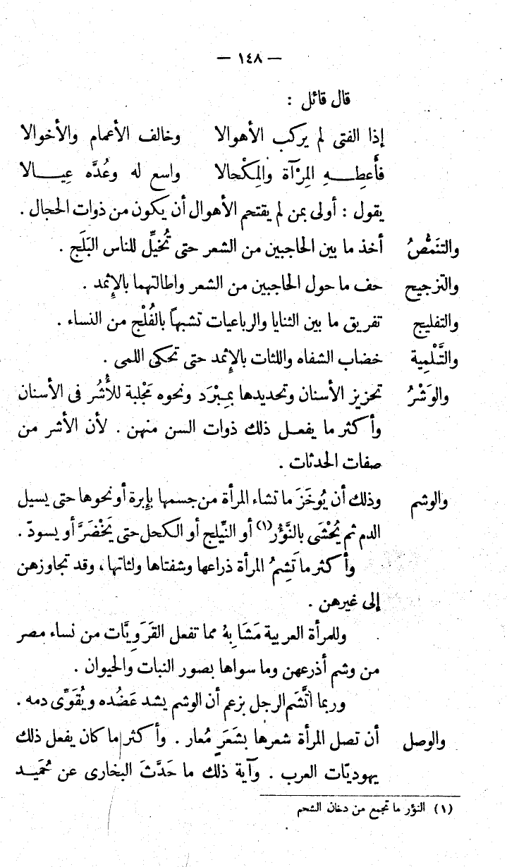 وللمرأة العربية مَشَابِهُ مما تفعل القَرَوِيات من نساء مصر من وشم أذرعهن وما سواها بصور النبات والحيوان.