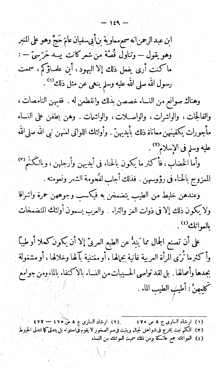 وهنالك صوانع من النساء خصصن بذلك وانقطعن له. ففيهن النامصات، والفالجات، والواشرات، والواصلات، والواشمات وهن يطفن على النساء مأجورات يكفيهنّ معانات ذلك بأيديهنّ. وأولئك اللواتي لعنهنّ نبي الله صلى الله عليه وسلم في الإسلام.