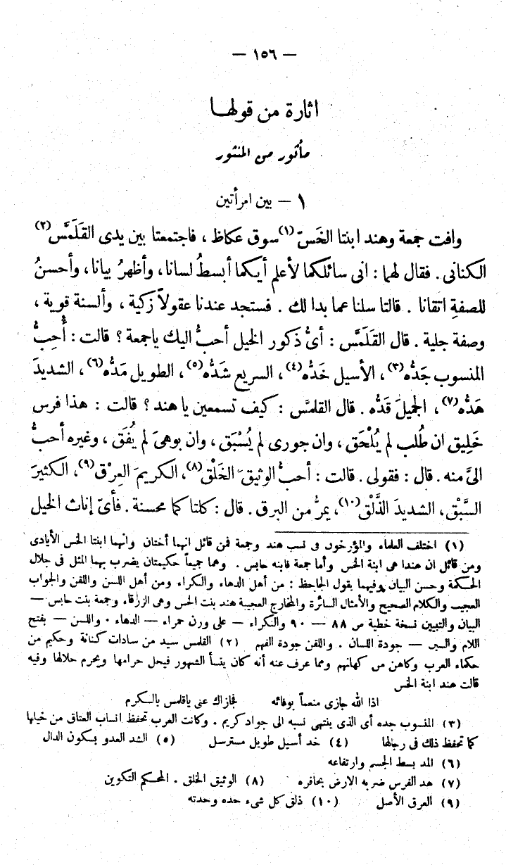 وافت جمعة وهند ابنتا الخَس سوق عكاظ. فاجتمعا بين يدي القَلمس الكناني فقال لهما: إني سائلكما لأعلم أبسط لسانا وأظهرُ بيان، وأحسن للصفة إتقانا. قالتا سلنا عما بدا لك. فستجد عندنا عقولاً زكية، وألسنة قوية وصفة جلية. قال القَلَمَّس: أيُّ ذكور الخيل أحب إليك يا جمعة؟ قالت: أُحبُ المنسوب جَدُّه، الأسيل خَدُّه، السريع شده، الطويل مَدُّه، الشديد هَدُّه، الجميل قَدُّه. قال القلمَّس: كيف تسمعين يا هند؟ قالت: هذا فرس خَلِيق إن طلب لم يُلْحَق، وإن جوري لم يُسْبق، وإن بوهي لم يُفق، وغير أحبُّ إلىّ منه. قال: فقولي قالت: أحبُ الوثيقَ الْخلق، الكريم العِرق الكثيرَ السَّبق، الشديد الذلق، يمرُّ من البرق. قال كلتا كما محسنة: فأي إناث الخيل