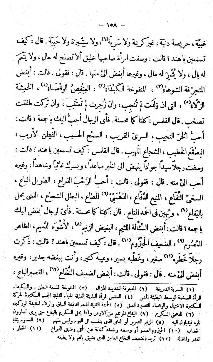 غبيّة، حريصة دنيَّة، كريمة ولا سَرِية، ولا ستَّيرة ولا حبيبة. قال: كيف تسمعين ياهند؟ قالت: وصفت امرأة صاحبها خليق ألا تصلح له حال، ولا يَنْعَمَ له بال، ولا يثمِرَ له مال، وغيرها أبغض إلى منها. قال: فقولي. قالت: أبغض المتجزَّفة الشوهاء، المنفوخة الكَبْداء، العِنفِص الوقْصاء، الحَمِشَة الزَّلاّء، التي إن وَلَدَت لم تنجب، وإن زُجرت لم تعتتب، وإن تركت طفقت تصخب. قال القلمس: كلتا كما محسنة. في الرجال أحب إليك يا جمعة؟ قالت: أحبّ الحُر النجيب، السري القريب، السمح