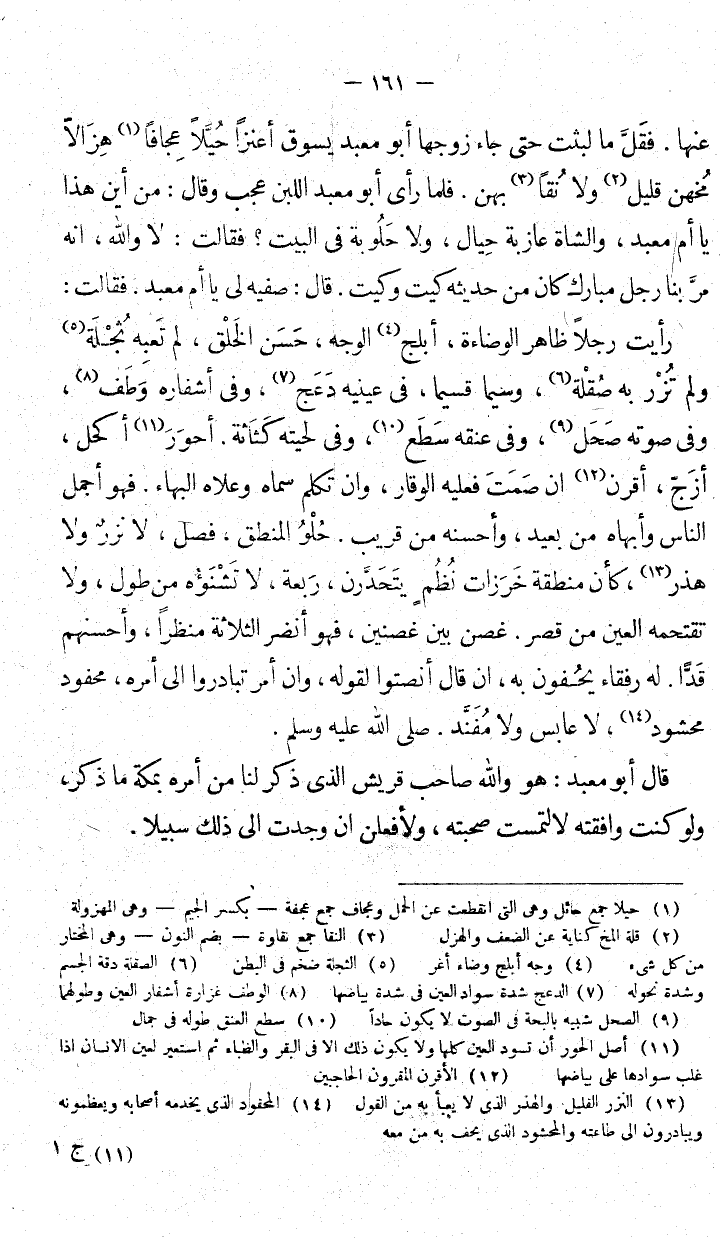 رأيت رجلاً ظاهر الوضاء، أبلج الوجه، حسَنَ الخلق، لم تعِبه ثُجْلَة، ولم تزْر به صُقلة، وسيما قسيما، في عينيه دعج، وفي أشفاره وطَف، وفي صوته صَحل، وفي عنقه سَطع، وفي لحيته كثاثة. أحور أكحل، أزَج، أقرن إن صمَت فعليه الوقار، وإن تكلم سماء وعلاه البهاء. فهو أجمل الناس وأبهاه من بعيد، وأحسنه من قريب. حُلْوُ المنطق، فصل، لا نزرٌ ولا هذر، كأن منطقة خَرَزات نُظمٍ يَتَحدّرن، ربعة، لا تشْنُؤُه من طول، ولا تقتحمه العين من قصر. غصن بين غصنين، فهو أنضر الثلاثة منظرا، وأحسنهم قَداً. له رفقاء يُحفون به، إن قال أنصتوا لقوله، وإن أمر تبادروا إلى أمره، محفود محشود، لا عابس ولا مُفند. صلى الله عليه وسلم.