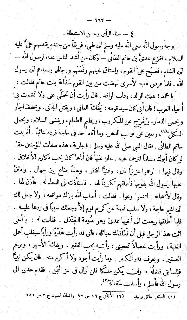 ويعين على نوائب الدهر، وما أتاه في حاجة فردّه خائباً، أنا بنت حاتم الطائي. فقال النبي صلى الله عليه وسلم: يا جارية، هذه صفات المؤمنين حقاً. لو كان أبوك مسلماً لترحمنا عليه. خلوا عنها فإن أباها كان يحب مكارم الأخلاق. وقال فيها: ارحموا عزيزاً ذل، وغنيا افتقر، وعالماً ضاع بين جهال. وقال لأصحابه: اسمعوا وعوا. فقالت: أصاب الله ببرَّك مواقعه، ولا جل لك إلى لئيم حاجة، ولا سلب نعمة عن كريم قوم إلا وجعلك سبباً في ردّها عليه، فلما أطلقها إلى أخيها عدي وهو بدُومة الَجندل. فقالت له: يا أخي ائت هذا الرجل قبل أن تَعْلقَك حبائله. فإني قد رأيت هَدْياً سيغلب أهل الغلبة، ورأيت خصالاً تعجبني: رأيته يحب الفقير. ويفُكُّ الأسير. ويرحم الصغير ويعرف قدر الكبير. وما رأيت أجود ولا أكرم منه. فإن يكن نبياً فللسابق فضله. وإن يكون ملكاً فلن تزال في عز اليمن. فقدم عدي إلى رسول الله فأسلم وأسلمت سَفانة.