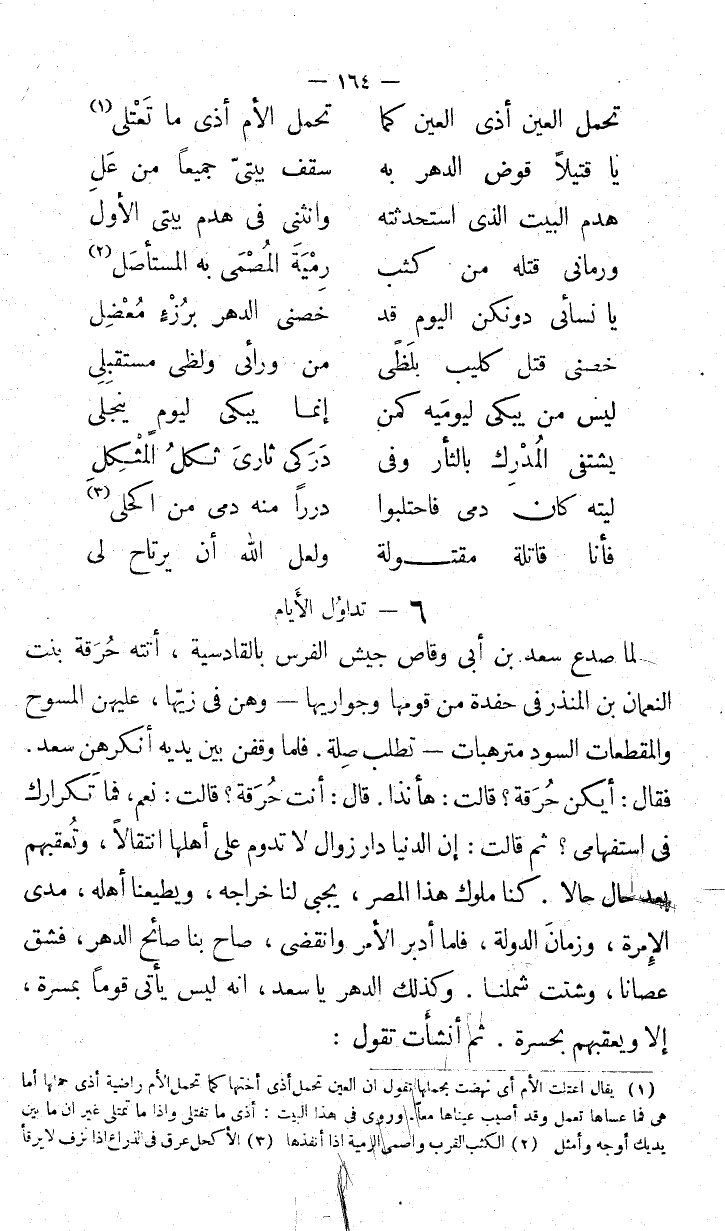 استفهامي؟ ثم قالت: إ، الدنيا دار زوال لا تدوم على أهلها انتقالا، وتُعقبهم بعد حال حالا. كنا ملوك هذا المصر. يجبي لنا خراجه، ويطيعنا أهله، مدى الإمرة، وزمان الدولة، فلما أدبر الأمر وانقضى، صاح بنا صائح الدهر، فشق عصانا، وشتت شملنا. وكذلك الدهر يا سعد. إنه ليس يأتي قوماً بمسرة، إلا ويعقبهم بحسرة. ثم أنشأت تقول: