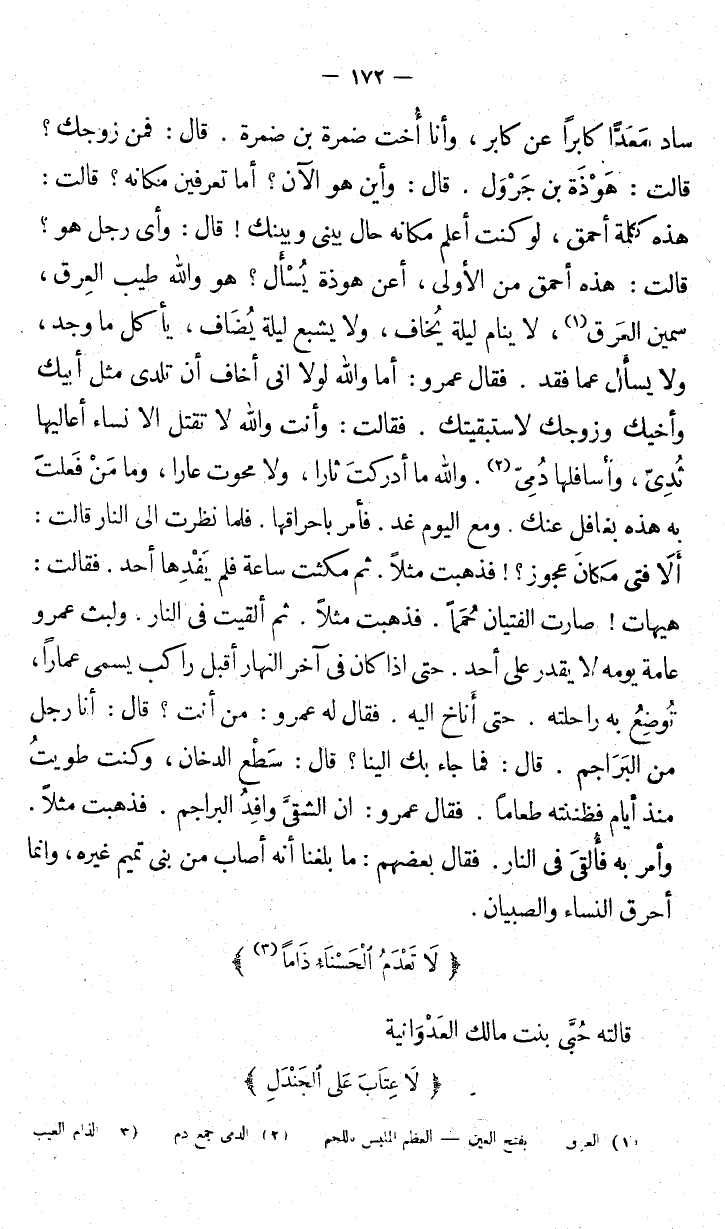 ساد معدا كابراً عن كابر، وأنا أخت ضمرة بن ضمرة. قال. فمن زوجك؟ قالت: هو هَوْذَة بن جَرْوَل. قال: وأين الآن؟ أما تعرفين مكانه؟ قالت: هذه كلمة أحمق، لو كنت أعلم مكانه حال بيني وبينك، قال: وأي رجل هو؟ قالت: هذه أحمق من الأولى، أعن هوذة يُسْأل؟ وهو والله طيب العرق، سمين العَرق لا ينام ليلة يُخاف، ولا يشبع ليلةُ يُضَاف، يأكل ما