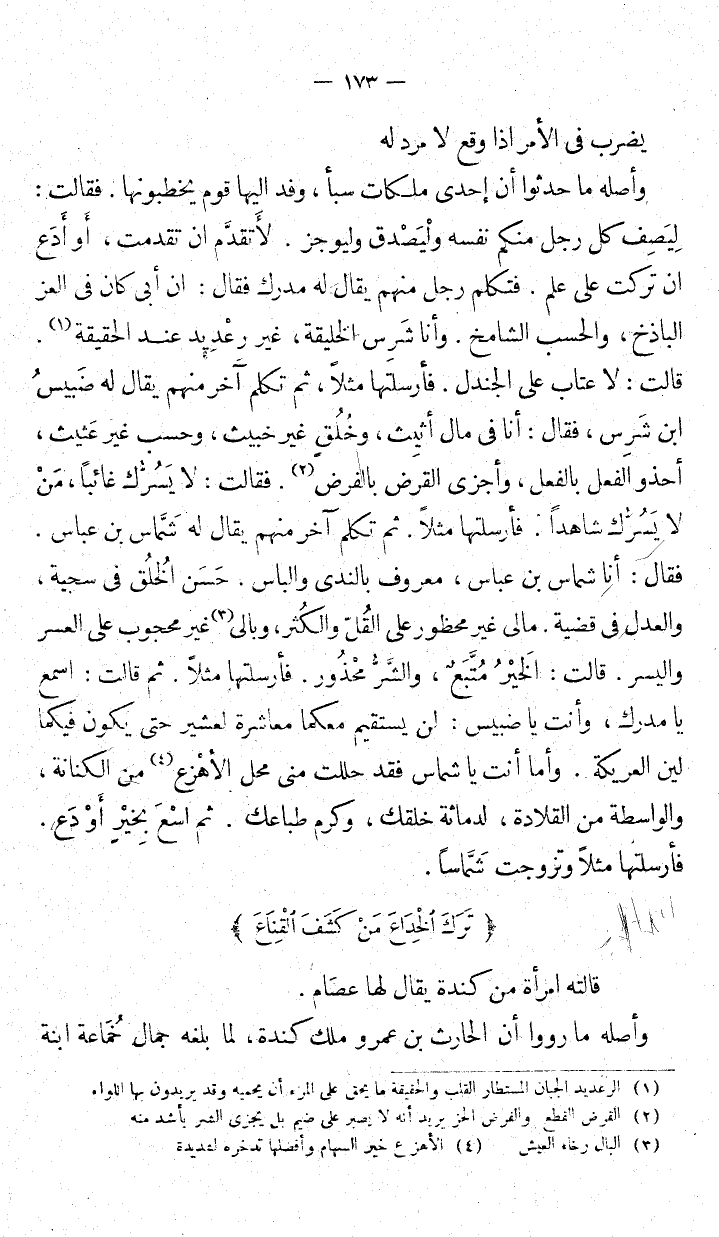 منهم يقال له شَمَّاس ابن عباس، فقال: أنا شماس بن عباس، معروف بالندى والبأس. حسن الخُلُق في سجية والعدل في قضية. مالي غير محظور على القُلَّ والكُثر، وبالي غير محجوب على العسر واليسر. قالت: الخَيْرُ مُتّنَعٌ، والشّر مَحْذُوف: فأرسلتها مثلا؛ ثم قالت اسمع يا مدرك وأنت يا ضبيس: لن يستقيم معكما معاشرة لعشير حتى يكون فيكما لين العريكة: وأما أنت يا شمس فقد حللت مني محل الأهْزع من الكنانة والواسطة من القلادة، لدماثة خلقك وكرم طباعك: ثم اسْع بِخَيْر أَوْدع: فأرسلتها مثلا وتزوجت شَماساً.