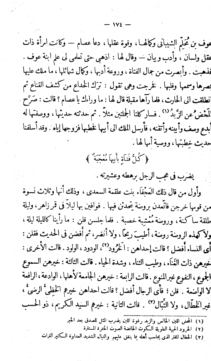 وروضة مُعْشبة خصبة. فلما جلسن قلن: ما رأينا كالليلة ليلة، ولا كهذه الروضة روضة، أطيبَ ريحاً، ولا أنضر، ثم أفضن في الحديث فقلن: أي النساءِ أفضل؟ قالت إحداهن الخرود الودود، الولود قالت الأخرى: خيرهن ذات الغَنَاء، وطيب الثناء، وشدة الحياء قالت الثالثة: خيرهن السموع الجموع، النفوع غير المنوع، قالت الرابعة: خيرهن الجامعة لأهلها، الوادعة، الرافعة لا الواضعة. قلن: فأي الرجال أفضل؟ قالت إحداهن خيرهم الحَظِيٌّ الرضىُّ الخَطال ولا التّبّال. قالت الثانية. خيرهم السيد الكريم، ذو الحسب