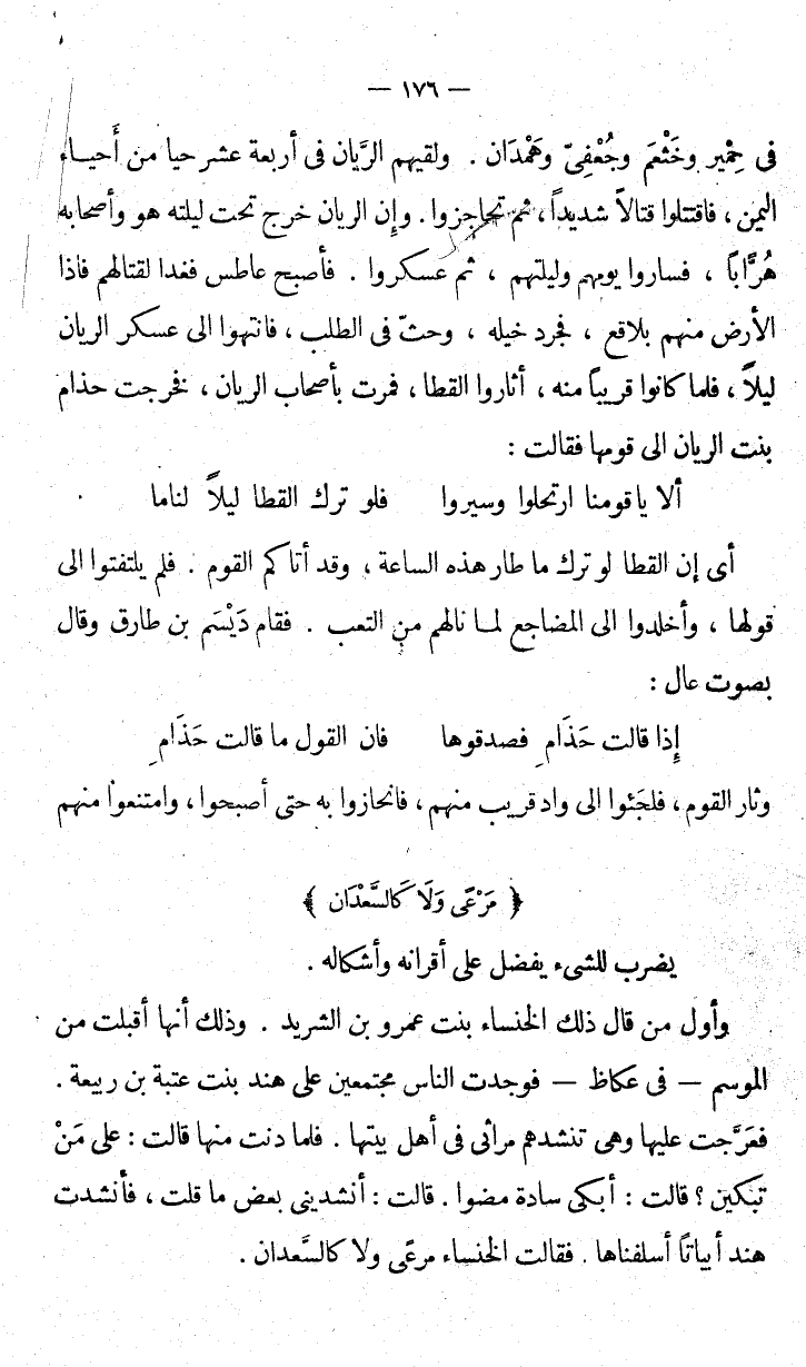 في حمير وخَثْعَم وجُعْفي وهَمْدَان. ولقيهم الريان في أربعة عشر حيا من أحياء اليمن فاقتتلوا قتالا شديداً. ثم تحاجزوا. وإن الريان خرج تحت ليلته هو وأصحابه هُرباً، فساروا يومهم وليلتهم، ثم عسكروا، فأصبح عاطس فغدا لقتالهم فإذا الأرض منهم بلاقع، فجرد خيله، وحث في الطلب، فانتبهوا إلى عسكر الريان ليلا؛ فلما كانوا قريباً منه، أثار القطا، فمرت بأصحاب الريان، فخرجت حذام بنت الريان إلى قومها فقالت: