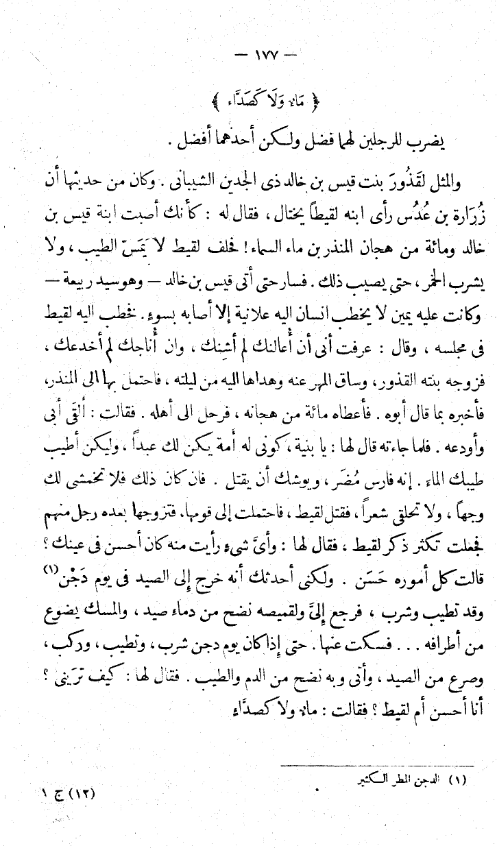 والمثل لقَذور بنت قيس بن خالد ذي الجدين الشيباني. وكان من حديثها أن زُرارة ابن عُدُس رأى لقيطاً يختال، فقال له: كأنك أصبت ابنة قيس بن خالد ومائة من هجان المنذر بن ماء السماء! فحلف لقيط لا يَمَسّ الطيب، ولا يشرب الخمر، حتى يصيب ذلك. فسار حتى أتى قيس بن خالد - وهو سيد ربيعة - وكانت عليه يمين لا يخطب إنسان إليه علانية إلا أصابه بسوءٍ، فخطب إليه لقيط في مجلسه، وقال: عرفت أني إن أُعالنك أشِنك، وإن اُناجك لم أخدعك، فزوجه بنته القذور، وساق المهر عنه أهداها إليه من ليلته، فاحتمل بها إلى المنذر، فأخبره بما يقال أبوه، فأعطاه مائة من هجانه، فرحل إلى أهله. فقالت: ألقي أبي وأودعه. فلما جاءته قال لها: يا بنية، كوني له أمة يكن لك عبدا، وليكن أطيب طيبك الماء. إنه فارس مُضر، ويوشك أن يقتل. فإن كان ذلك فلا تخمشي لك وجها، ولا تحلقي شعراً، فقتل لقيط، فاحتملت إلى قومها، فتزوّجها بعده رجل منهم فجعلت تكثر ذكر لقيط فقال لها: وأيَّ شيءٍ رأيت منه كان أحسن في عينك؟ قالت كل أموره حَسَن: ولكني أحدثك أنه خرج إلى الصيد في يوم دجن وقد تطيب وشرب، فرجع إلىّ ولقميصه نضح من دماء صيده، والمسك يضوع من أطرافه. . . فسكت عنها. حتى إذا كان يوم دجن شرب، وتطيب، وركب وصرع من الصيد، وأتى به نضح من الدم والطيب فقال لها: كيف تَريني؟ أنا أحسن أم لقيط؟ فقالت: ماءٌ ولا كصدَّاءٍ.
