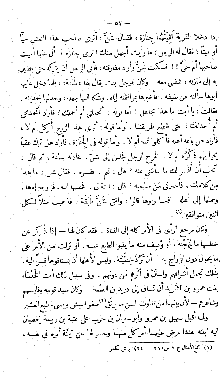 إذا دخلا القرية لقَيتهما جنازة، فقال شنٌّ: أترى صاحب هذا النعش حيّاً أو ميتاً؟ فقال له الرجل: ما رأيت أجهل منك! ترى جنازة تسأل عنها أميت صاحبها أم حيٌّ؟! فسكت شنٌّ وأرد مفارقته، فأبى الرجل أن يتركه حتى يصير به إلى منزله. فمضى معه. وكان للرجل بنت يقال لها طَبَقَةَ، فلما دخل عليها أبوها سألته عن ضيفه. فأخبرها بمرافقته إياه وشكا غليها جهله، وحدثها بحديثه. فقالت: يا أبت ما هذا بجاهل! أما قوله: أتحملني أم أحملك؟ فأراد أتحدثني أم أحدثك، حتى نقطع طريقنا. وأما قوله: أترى هذا الزرع أُكل أم لا، فأراد هل باعه أهله فأكلوا ثمنه أم لا. وأما قوله في الجنازة، فأراد هل ترك عقباً يحيا بهم ذكْره أم لا. فخرج الرجل فجلس إلى شنّ، فحادثه ساعة ثم قال: أتحب أن أفسر