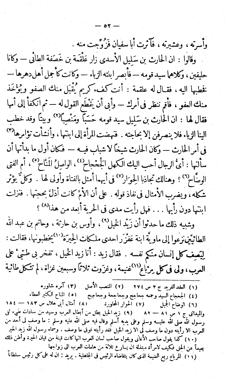 وشبيه ذلك ما حدثوا أن زيد الخيل، وأوس بن حارثة، وحاتم بن عبد الله الطائيين نزعوا إلى ماوية ابنة عفْزر إحدى ملكات الحيرة يخطبونها فقالت: ليصف كل إنسان منكم نفسه. فقال زيد: أنا زيد الخليل، تفخر بي طّي على العرب، ولي في كل مرْباع غنيمة، وغزوت ثلاثاً وسبعين غزاة، لم تثكل طائية
