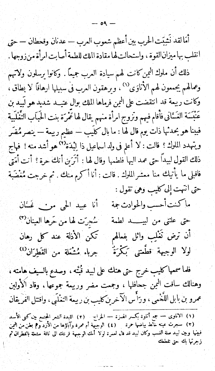 أما لقد نشبت الحرب بين أعظم شعوب العرب - عدنان وقحطان - حتى انقلب بها ميزان القوة، واستحالت لها مقادة الملك للطمة أصابت امرأة من زوجها.