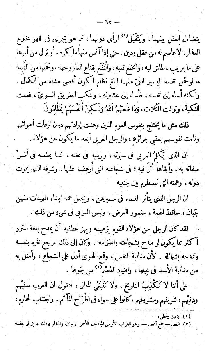 ذلك مثل ما يختلج بنفوس القوم الذين وهنت إرادتهم دون نزعات أهوائهم وناءت نفوسهم بعقبى جرائرهم، والرجل العربي أبعد ما يكون عن هؤلاء. إن الذي يكْلمُ