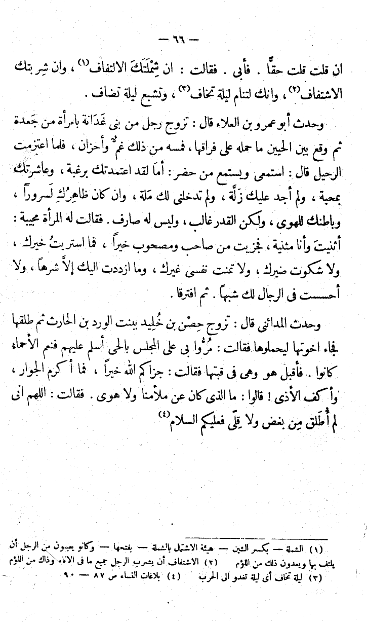 إن قلت قلت حقا. فأبى. فقالت: إن شملتك الالتفاف. وإن شربتك الاشتفاف، وإنك لتنام ليلة تخاف، وتشبع ليلة تضاف.