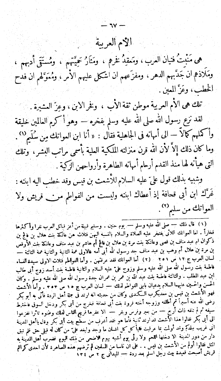 هي منبت فتيان العرب ومعْقدُ فخرهم، ومَثَارُ حميتهم، ومُستَقَ أدبهم، وملاذهم إن جدَّ بهم الدهر، ومفزعهم إن أشكل عليهم الأمر، ومُعولهم غن فدح الخطب، وعز المعين. تلك هي الأم العربية موطن ثقة الأب وفخر الابن، وعز العشيرة.