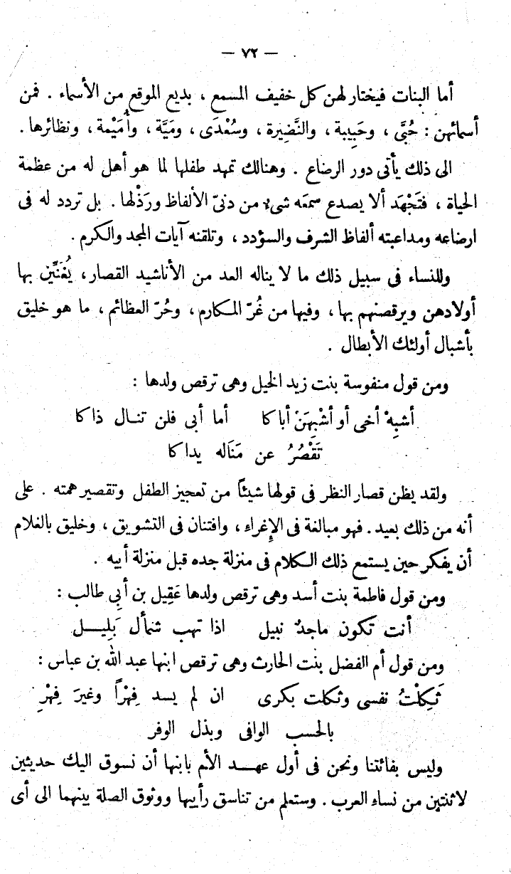أما البنات فيختار لهن خفيف المسمع؛ بديع الموقع من الأسماء. فمن أسمائهن حُبَّى وبَيِبة والنَّضيرة؛ وسُعدى؛ ومَيَّة؛ وأُميمة؛ ونظائرها.