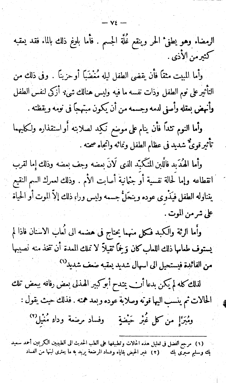 وأما المبيت مئقاً فأن يقضي الطفل ليلة مُغْضَباً أو حزيناً. وفي ذلك أمن التأثير على نوم الطفل وذات نفسه ما فيه وليس هنالك أزكى لنفس الطفل وأنهض بعقله وأصفى لدمه وجسمه من أن يكون مبتهجاً في نومه ويقظته.