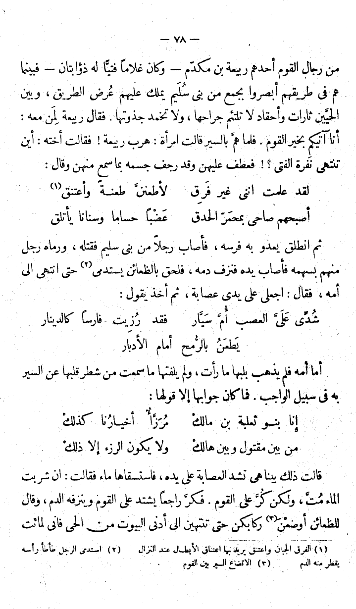 قالت ذلك بينما هي تشد العصابة، فاستسقاها ماء فقالت إن شربت الماء مت؛ ولكن كُر على القوم فكر راجعاً يشتد على القوم وينزفه الدم؛ وقال للظعائن أوضعنْ ركابكن حتى تنتهين إلى أدنى البيوت من الحي فإني لمائت