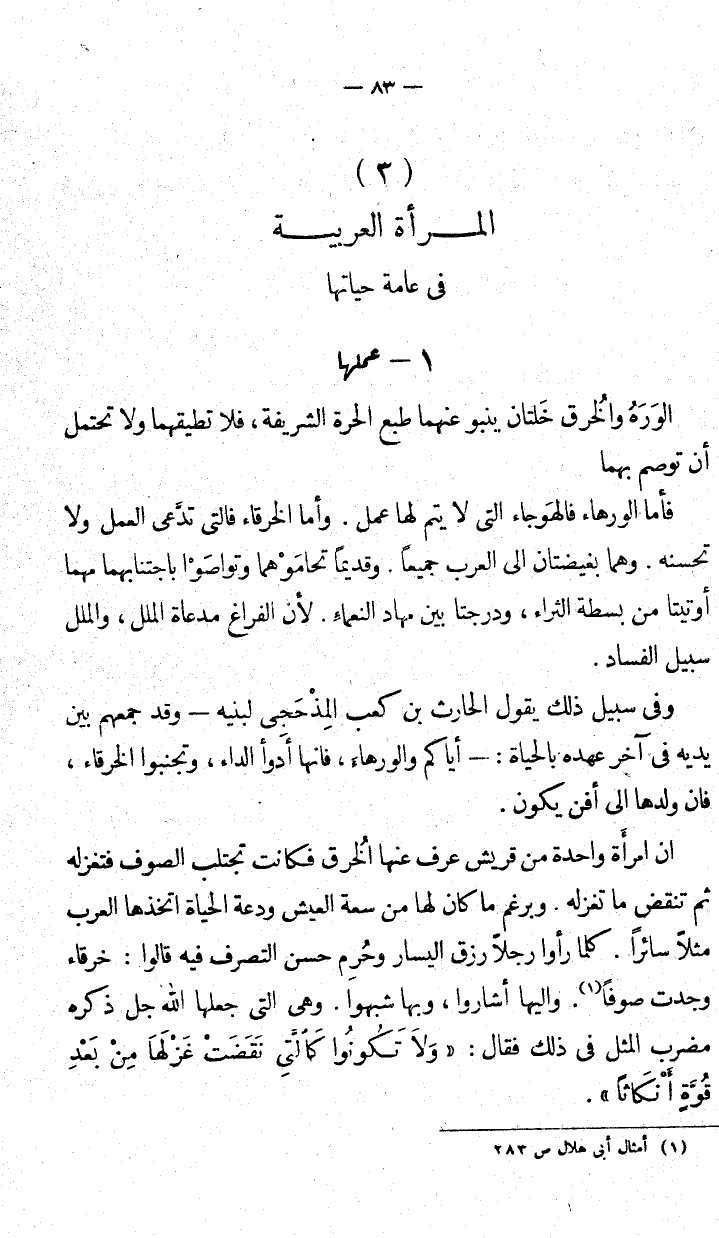 فأما الورهاء فالهوجاء التي لا يتم لها عمل. وأما الخرقاء فالتي تدعى العمل ولا تحسنه. وهما بغيضتان إلى العرب جميعاً. وقديماً تحاموْهما وتواصَوا باجتنابهما مهما أوتيتا من بسطة الثراء. ودرجتا بين مهاد النعماءِ لأن الفراغ مدعاة الملل، والملل سبيل الفساد.