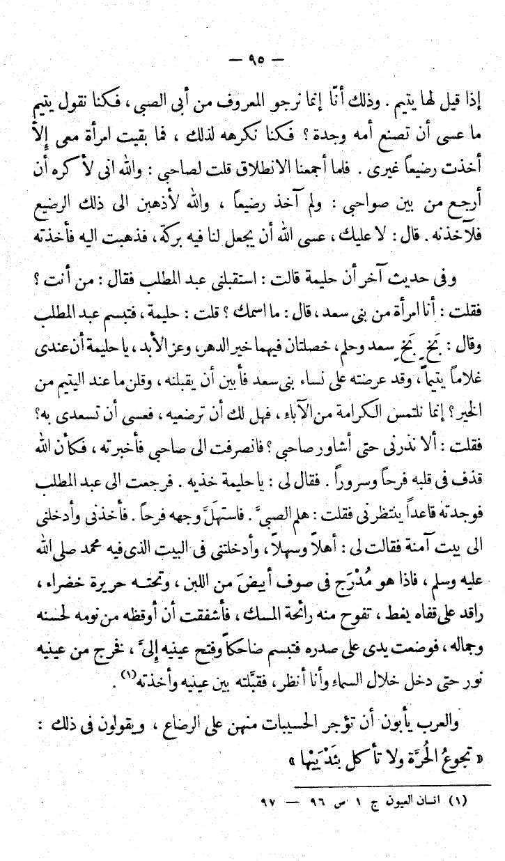 الانطلاق قلت لصاحبي: والله إني لأكره أن أرجع من بين صواحبي: ولم آخذ رضيعاً والله لأذهبن إلى ذلك الرضيع فلآخذته. قال: لا عليك، عسى الله أن يجعل لنا فيه بركة، فذهبت إليه فأخذته.