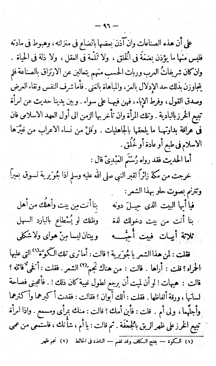 فقلت لمن هذا الشعر يا جُويرية؟ فقالت: أما ترى تلك الكَوَّة التي عليها الحمراءُ قلت: أراها. قالت: من هناك نجم الشعر. فقلت: أفحَيٌّ قائله؟ قالت هيهات! لو أن لميت أن يرجع لطول غيبة كان ذلك!. فأعجبني فصاحة لسانها، ورقة ألفاظها. فقلت ألك أبوان؟ فقالت: فقدت أكبرهما وأكثرهما وأجلَّهما، ولي أم. قلت: فأين أمك قالت: منك بمرأى ومسمع. وإذا امرأة تبيع الخرز على ظهر الريق بالجُحْفة. ثم قالت: ياأم، شأْنك، فاستمعي من عمي