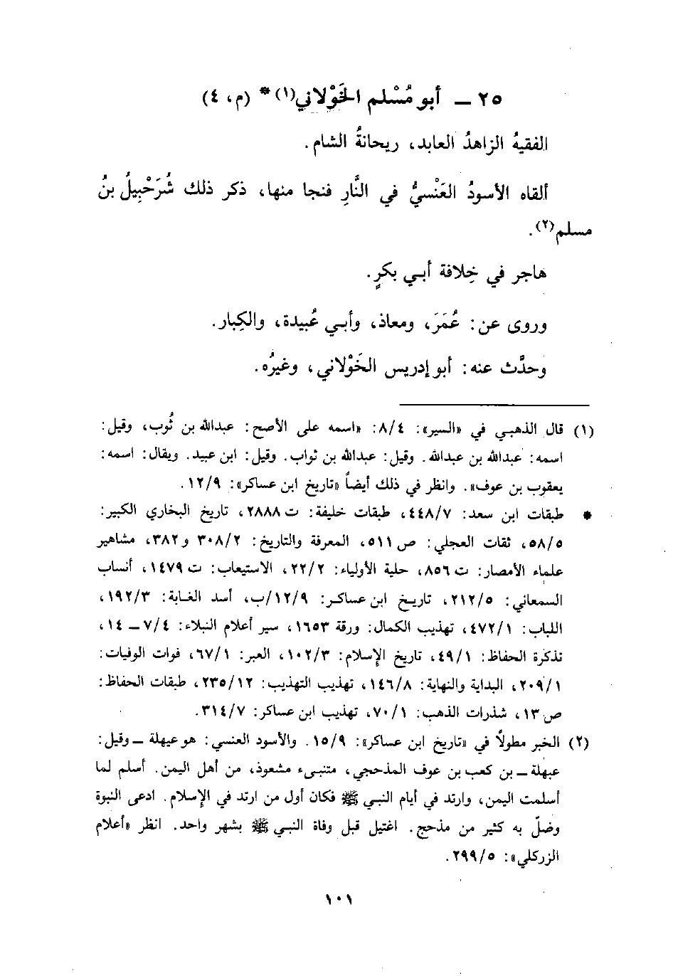 ألقاه الأسودُ العَنْسيُّ في النَّارِ فنجا منها، ذكر ذلك شُرَحْبِيلُ بنُ مسلم (¬2).