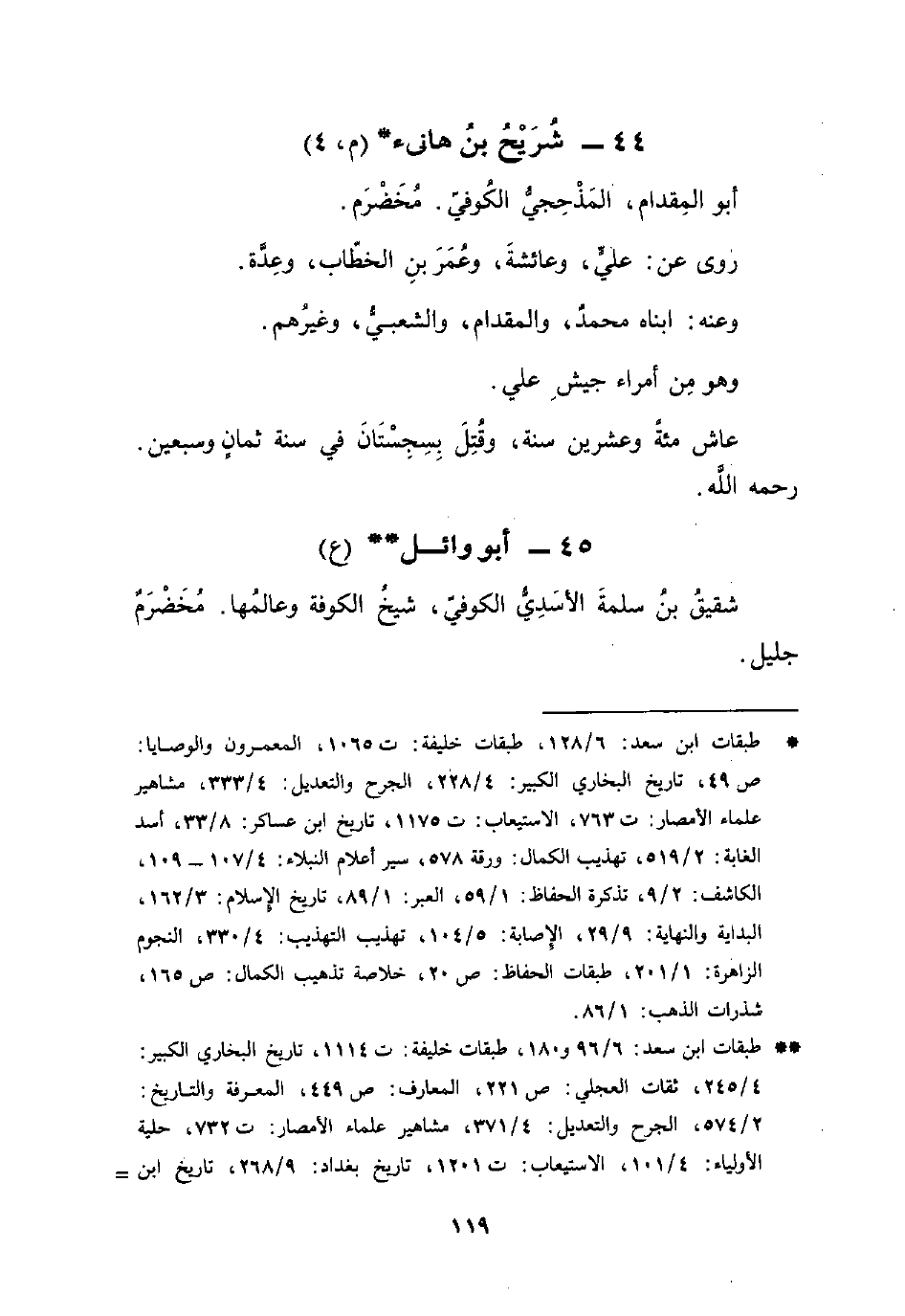 * * طبقات ابن سعد: 6/ 96 و 180، طبقات خليفة: ت 1114، تاريخ البخاري الكبير: 4/ 245، ثقات العجلي: ص 221، المعارف: ص 449، المعرفة والتاريخ: 2/ 574، الجرح والتعديل: 4/ 371، مشاهير علماء الأمصار: ت 732، حلية الأولياء: 4/ 101، الاستيعاب: ت 1201، تاريخ بغداد: 9/ 268، تاريخ ابن =