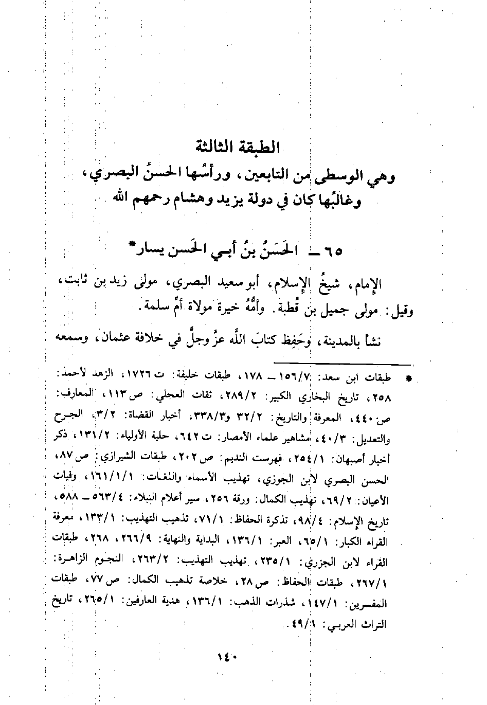 الطبقة الثالثة وهي الوسطى من التابعين، ورأسُها الحسنُ البصري، وغالبُها كان في دولة يزيد وهشام رحمهم الله