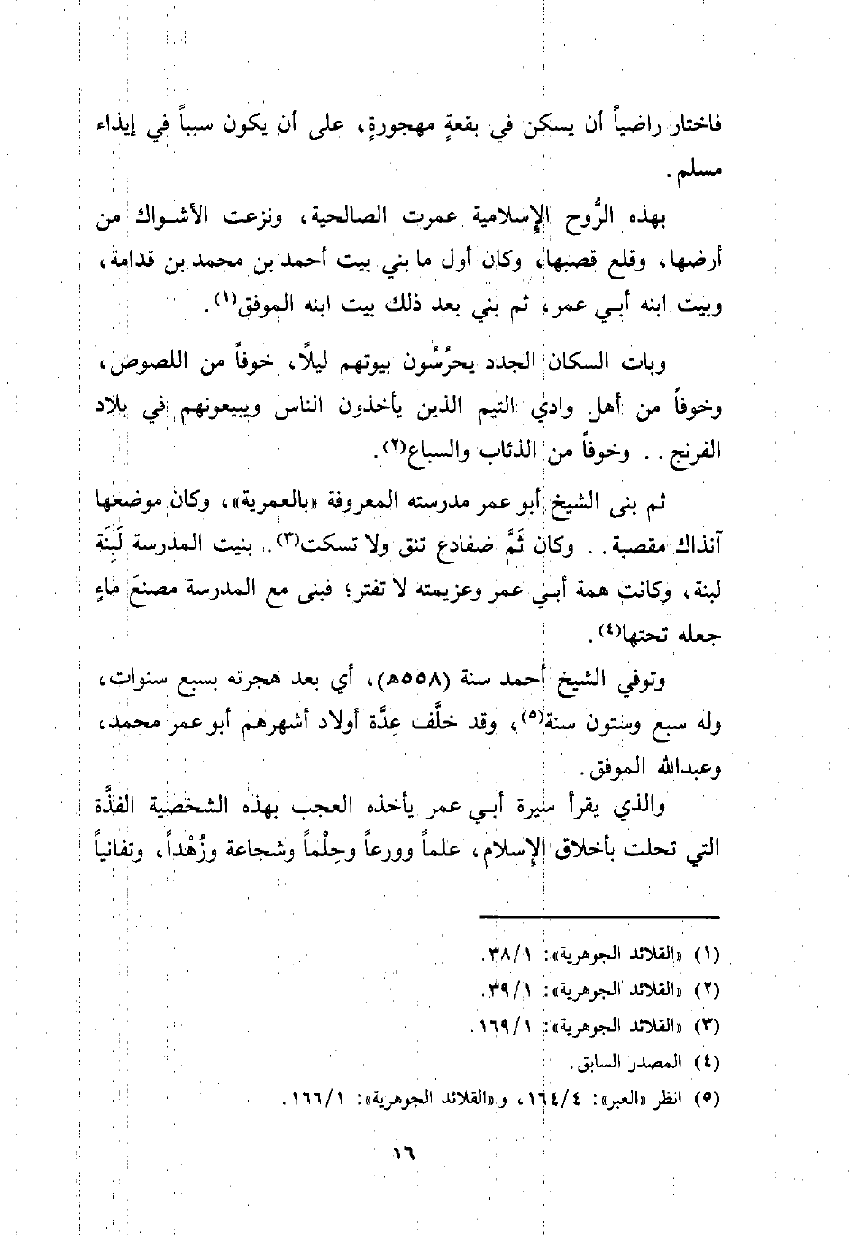 بهذه الرُّوح الإِسلامية عمرت الصالحية، ونزعت الأشواك من أرضها، وقلع قصبها، وكان أول ما بني بيت أحمد بن محمد بن قدامة، وبيت ابنه أبي عمر، ثم بني بعد ذلك بيت ابنه الموفق (¬1).