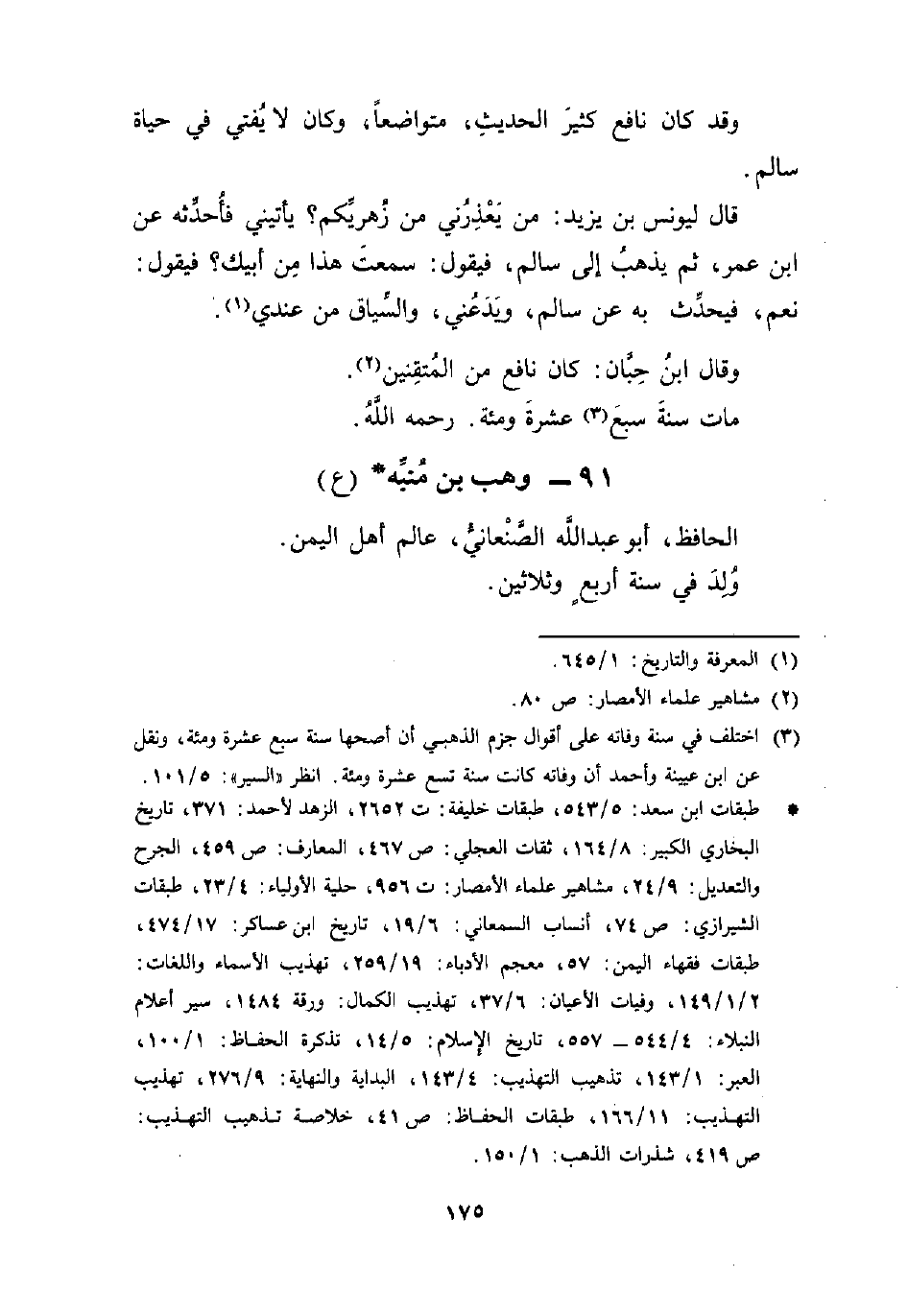 * طبقات ابن سعد: 5/ 543، طبقات خليفة: ت 2652، الزهد لأحمد: 371، تاريخ البخاري الكبير: 8/ 164، ثقات العجلي: ص 467، المعارف: ص 459، الجرح والتعديل: 9/ 24، مشاهير علماء الأمصار: ت 956، حلية الأولياء: 4/ 23، طبقات الشيرازي: ص 74، أنساب السمعاني: 6/ 19، ناريخ ابن عساكر: 17/ 474، طبقات فقهاء اليمن: 57، معجم الأدباء: 19/ 259، تهذيب الأسماء واللغات: 2/ 1 / 149، وفيات الأعيان: 6/ 37، تهذيب الكمال: ورقة 1484، سير أعلام النبلاء: 4/ 544 - 557، تاريخ الإِسلام: 5/ 14، تذكرة الحفاظ: 1/ 100، العبر: 1/ 143، تهذيب التهذيب: 4/ 143، البداية والنهاية: 9/ 276، تهذيب التهذيب: 11/ 166، طبقات الحفاظ: ص 41، خلاصة تهذيب التهذيب: ص 419، شذرات الذهب: 1/ 150.