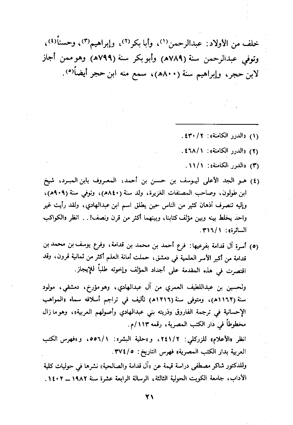 (¬5) أسرة آل قدامة بفرعيها: فرع أحمد بن محمد بن قدامة، وفرع يوسف بن محمد بن قدامة من أكبر الأسر العلمية في دمشق، حملت أمانة العلم أكثر من ثمانية قرون، وقد اقتصرت في هذه المقدمة على أجداد المؤلف وإخوته طلبًا للإِيجاز.