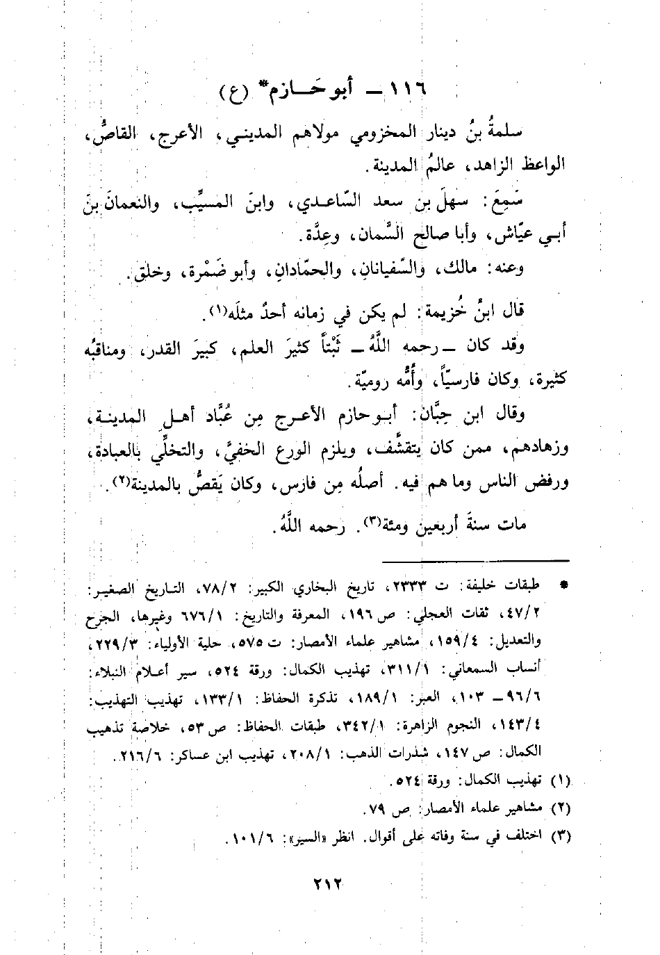 وقال ابن حِبَّان: أَبو حازم الأعرج مِن عُبَّاد أهلِ المدينة، وزهادهم، ممن كان يتقشَّف، ويلزم الورع الخفيَّ، والتخلِّي بالعبادة، ورفض الناس وما هم فيه. أصلُه مِن فارس، وكان يَقصُّ بالمدينة (¬2).