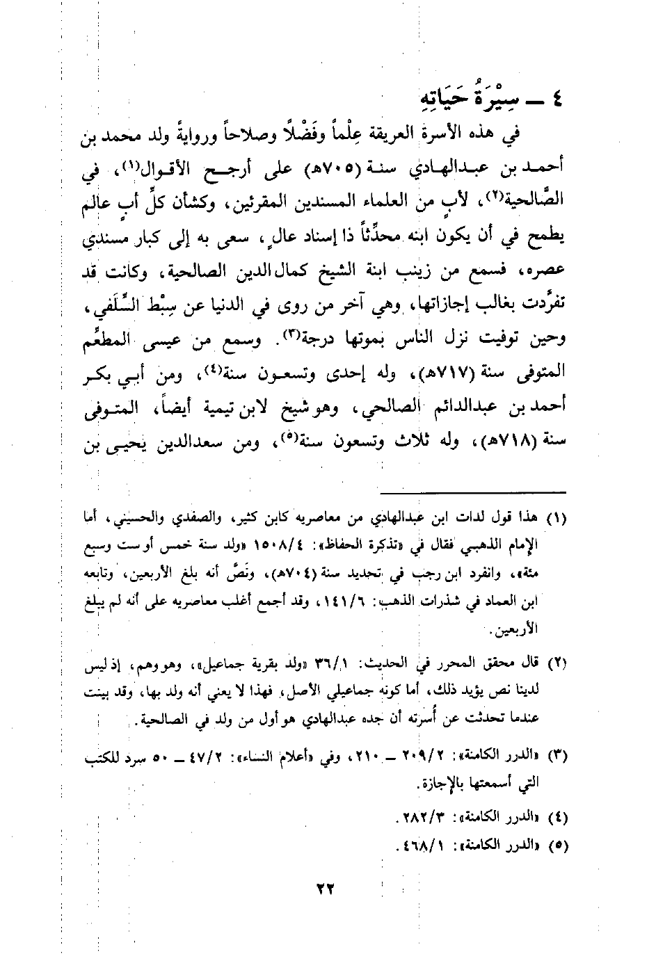 (¬1) هذا قول لدات ابن عبد الهادي من معاصريه كابن كثير، والصفدي والحسيني، أما الإمام الذهبي فقال في "تذكرة الحفاظ": 4/ 1508 "ولد سنة خمس أو ست وسبع مئة"، وانفرد ابن رجب في تحديد سنة (704 هـ)، ونَصَّ أنه بلغ الأربعين، وتابعه ابن العماد في شذرات الذهب: 6/ 141، وقد أجمع أغلب معاصريه على أنه لم يبلغ الأربعين.