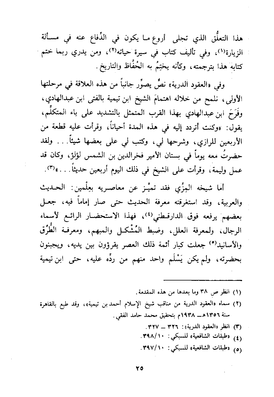 وفي "العقود الدرية" نصٌّ يصوِّر جانبًا من هذه العلاقة في مرحلتها الأولى، نلمح من خلاله اهتمامَ الشيخ ابن تيمية بالفتى ابن عبد الهادي، وفَرَحَ ابن عبد الهادي بهذا القرب المتمثل بالتشديد على ياء المتكلِّم، يقول: "وكنت أتردد إليه في هذه المدة أحيانًا، وقرأت عليه قطعة من الأربعين للرازي، وشرحها لي، وكتب لي على بعضها شيئًا ... ولقد حضرتُ معه يومًا في بستان الأمير فخر الدين بن الشمس لؤلؤ، وكان قد عمل وليمة، وقرأت على الشيخ في ذلك اليوم أربعين حديثًا ... " (¬3).