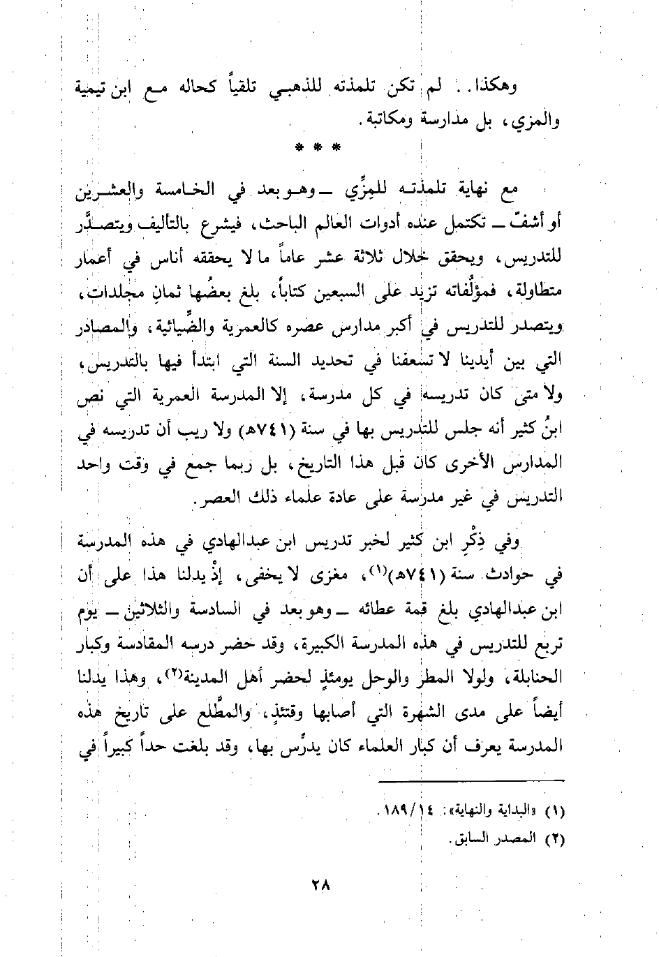 وفي ذِكْرِ ابن كثير لخبر تدريس ابن عبد الهادي في هذه المدرسة في حوادث سنة (741 هـ) (¬1)، مغزى لا يخفى، إذْ يدلنا هذا على أن ابن عبد الهادي بلغ قمة عطائه -وهو بعد في السادسة والثلاثين- يوم تربع للتدريس في هذه المدرسة الكبيرة، وقد حضر درسه المقادسة وكبار الحنابلة، ولولا المطر والوحل يومئذٍ لحضر أهل المدينة (¬2)، وهذا يدلنا أيضًا على مدى الشهرة التي أصابها وقتئذٍ، والمطَّلع على تاريخ هذه المدرسة يعرف أن كبار العلماء كان يدرِّس بها، وقد بلغت حدًّا كبيرًا في