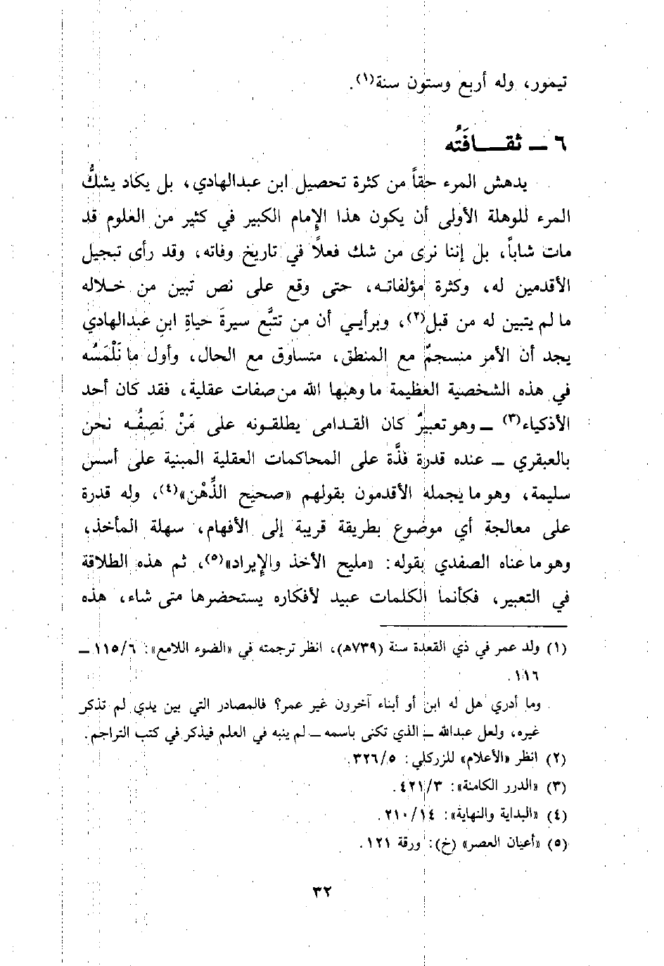 يدهش المرء حقًّا من كثرة تحصيل ابن عبد الهادي، بل يكاد يشكُّ المرء للوهلة الأولى أن يكون هذا الإمام الكبير في كثير من العلوم قد مات شابًّا، بل إننا نرى من شك فعلًا في تاريخ وفاته، وقد رأى تبجيل الأقدمين له، وكثرة مؤلفاته، حتى وقع على نص تبين من خلاله ما لم يتبين له من قبل (¬2)، وبرأيي أن من تتبَّع سيرةَ حياةِ ابنِ عبد الهادي يجد أن الأمر منسجمٌ مع المنطق، متساوق مع الحال، وأول ما نَلْمَسُه في هذه الشخصية العظيمة ما وهبها الله من صفات عقلية، فقد كان أحد الأذكياء (¬3) -وهو تعبيرٌ كان القدامى يطلقونه على مَنْ نَصِفُه نحن بالعبقري- عنده قدرة فذَّة على المحاكمات العقلية المبنية على أسس سليمة، وهو ما يجمله الأقدمون بقولهم "صحيح الذِّهْن" (¬4)، وله قدرة على معالجة أي موضوع بطريقة قريبة إلى الأفهام، سهلة المأخذ، وهو ما عناه الصفدي بقوله: "مليح الأخذ والإِيراد" (¬5)، ثم هذه الطلاقة في التعبير، فكأنما الكلمات عبيد لأفكاره يستحضرها متى شاء، هذه