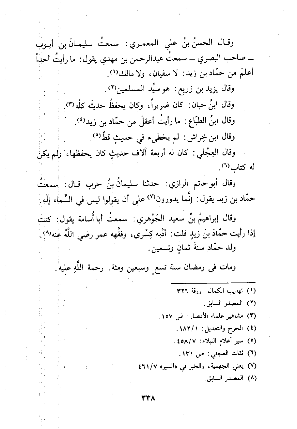 وقال الحسنُ بنُ على المعمري: سمعتُ سليمانَ بن أَيُّوب -صاحب البَصْرِيّ- سمعت عبد الرَّحْمَن بن مهدي يقول: ما رأيت أحدًا أعلمَ من حمَّاد بن زيد: لا سفيان، ولا مالك (¬1).