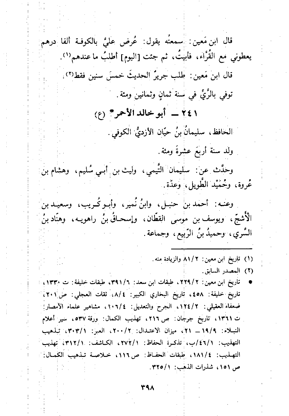 * تاريخ ابن معين: 2/ 229، طبقات ابن سعد: 6/ 391، طبقات خليفة: ت 1330، تاريخ خليفة: 458، تاريخ البخاري الكبير: 8/ 4، ثقات العجلي: ص 201، ضعفاء العقيلي: 2/ 124، الجرح والتعديل: 4/ 106، مشاهير علماء الأمصار: ت 1361، تاريخ جرجان: ص 216، تهذيب الكمال: ورقة 537، سير أعلام النبلاء: 9/ 19 - 21، ميزان الاعتدال: 2/ 200، العبر: 1/ 303، تذهيب التهذيب: 1/ 46 / ب، تذكرة الحفاظ: 1/ 272، الكاشف: 1/ 312، تهذيب التهذيب: 4/ 181، طبقات الحفاظ: ص 116، خلاصة تهذيب الكمال: ص 151، شذرات الذهب: 1/ 325.