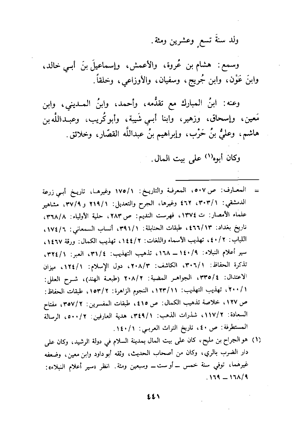 = المعارف: ص 507، المعرفة والتاريخ: 1/ 175 وغيرها، تاريخ أبي زرعة الدمشقي: 1/ 303، 462 وغيرها، الجرح والتعديل: 1/ 219 و 9/ 37، مشاهير علماء الأمصار: ت 1374، فهرست النديم: ص 283، حلية الأولياء: 8/ 368، تاريخ بغداد: 13/ 466، طبقات الحنابلة: 1/ 391، أنساب السمعاني: 6/ 174، اللباب: 2/ 40، تهذيب الأسماء واللغات: 2/ 144، تهذيب الكمال: ورقة 1467، سير أعلام النبلاء: 9/ 140 - 168، تذهيب التهذيب: 4/ 31، العبر: 1/ 324، تذكرة الحفاظ: 1/ 306، الكاشف: 3/ 208، دول الإسلام: 1/ 124، ميزان الاعتدال: 4/ 335، الجواهر المضية: 8/ 202 (طبعة الهند)، شرح العلل: 1/ 200، تهذيب التهذيب: 11/ 123، النجوم الزاهرة: 2/ 153، طبقات الحفاظ: ص 127، خلاصة تذهيب الكمال: ص 415، طبقات المفسرين: 2/ 357، مفتاح السعادة: 2/ 117، شذرات الذهب: 1/ 349، هدية العارفين: 2/ 500، الرسالة المستطرفة: ص 40، تاريخ التراث العربي: 1/ 140.