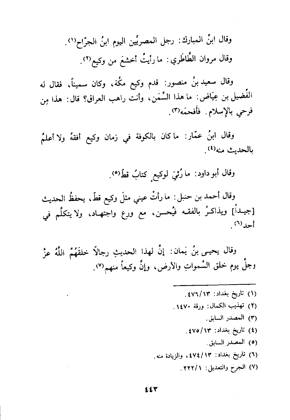 وقال يحيى بنُ يمان: إنَّ لهذا الحديثِ رجالًا خلقَهُمُ اللهُ عزَّ وجلَّ يوم خلق السَّمواتِ والأرض، وإنَّ وكيعًا منهم (¬7).