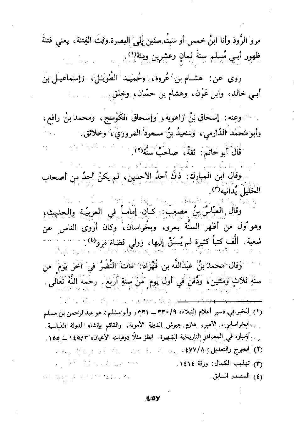 وقال محمد بن عبد اللَّه بن قُهْزاذ: مات النَّضْرُ في آخر يوم من سنةِ ثلاثٍ ومئتين، ودفن في أول يومٍ من سنةِ أربع. رحمه الله تعالى.