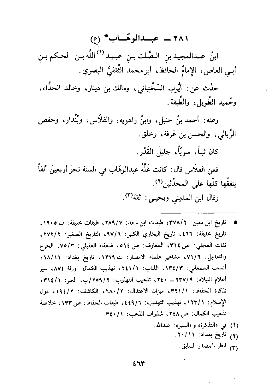 فعن الفلاس قال: كانت غَلّةً عبد الوهّاب في السنة نحوَ أربعينَ ألفًا ينفقُها كلّها على المحدِّثين (¬2).