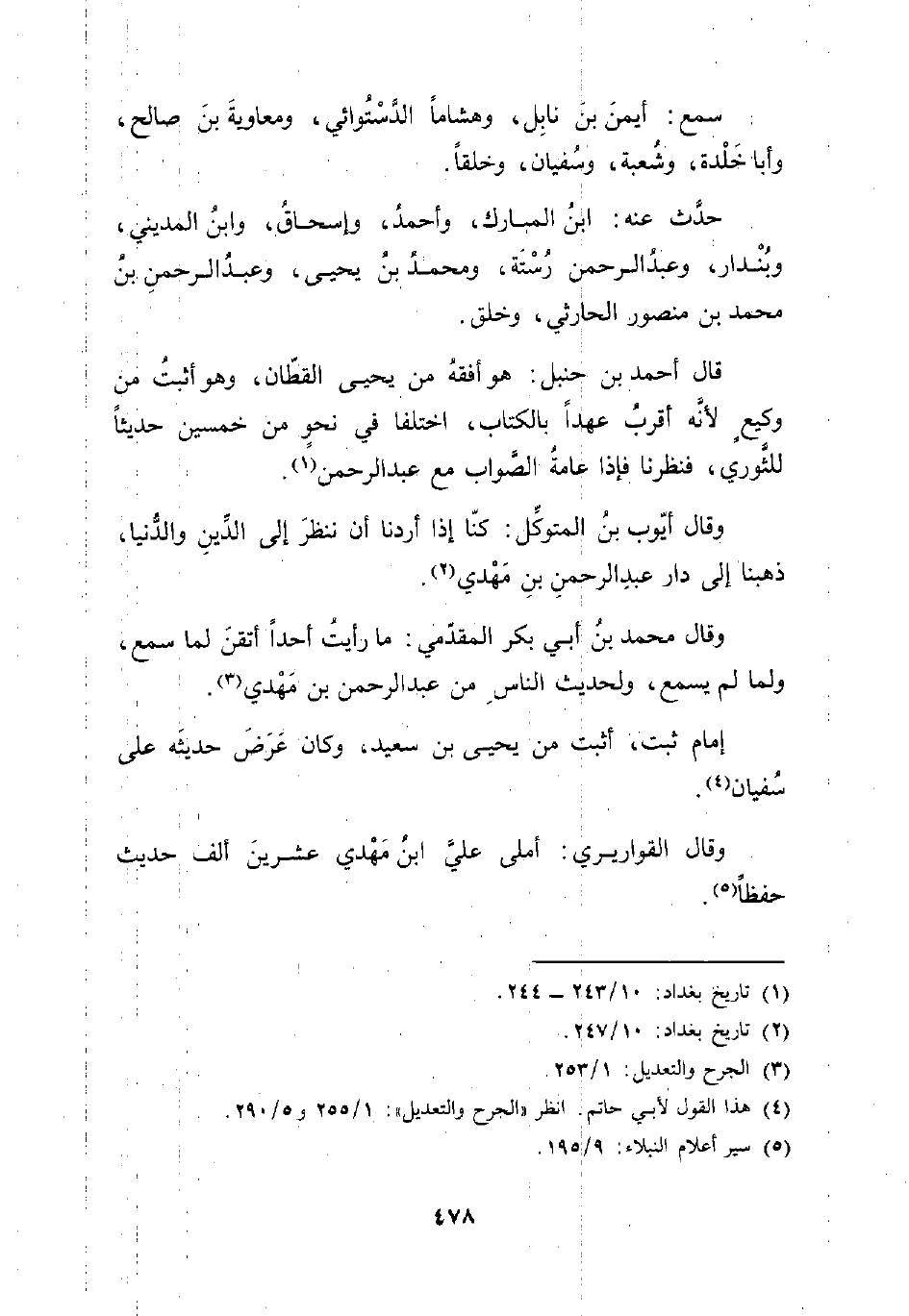 قال أحمد بن حنبل: هو أفقهُ من يحيى القطّان، وهو أثبتُ من وكيع لأنه أقربُ عهدًا بالكتاب، اختلفا في نحوٍ من خمسين حديثًا للثَّوري، فنظرنا فإذا عامة الصَّواب مع عبد الرحمن (¬1).