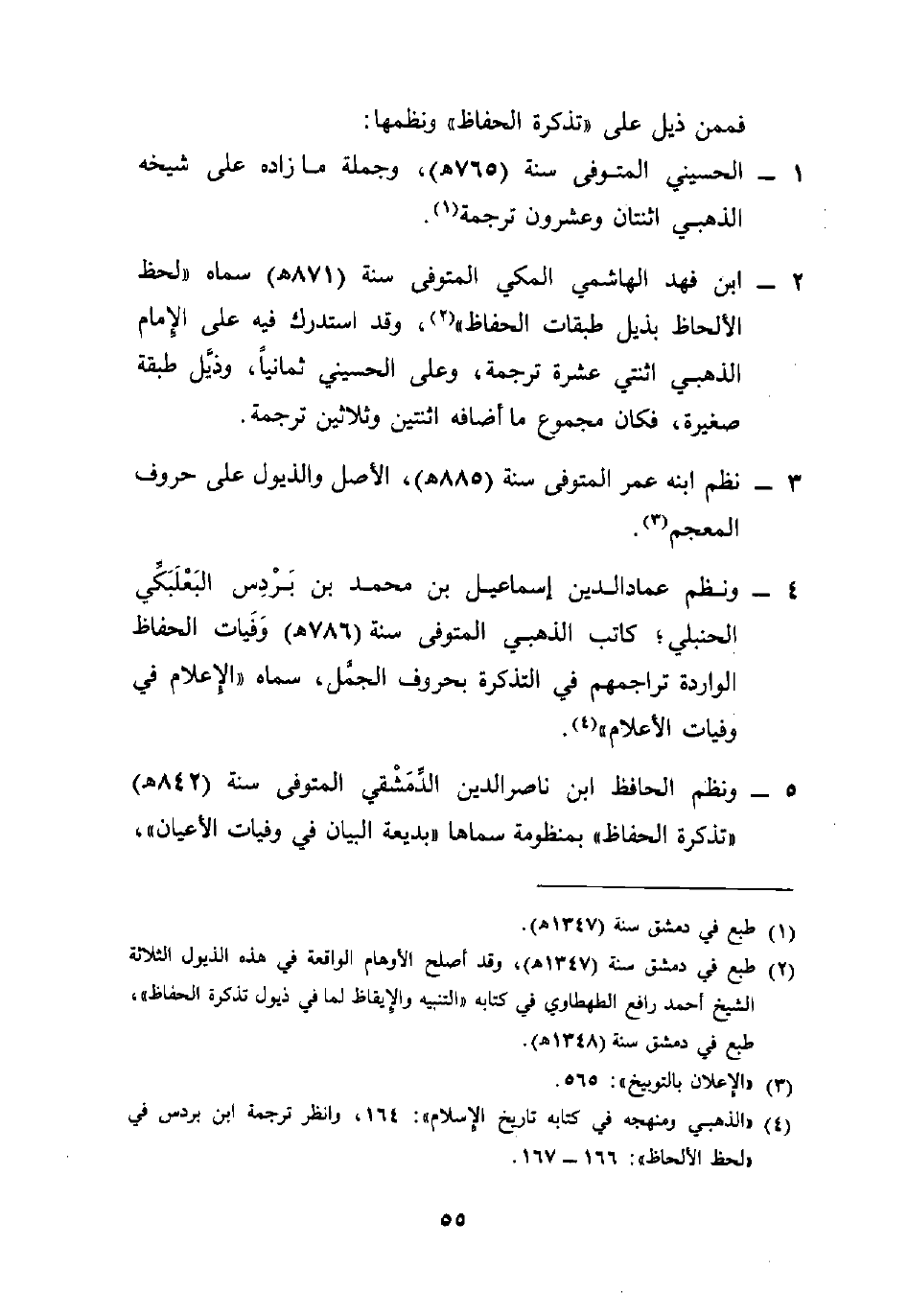 (¬2) طبع في دمشق سنة (1347 هـ)، وقد أصلح الأوهام الواقعة في هذه الذيول الثلاثة الشيح أحمد رافع الطهطاوي في كتابه "التنبيه والإيقاظ لما في ذيول تذكرة الحفاظ"، طبع في دمشق سنة (1348 هـ).