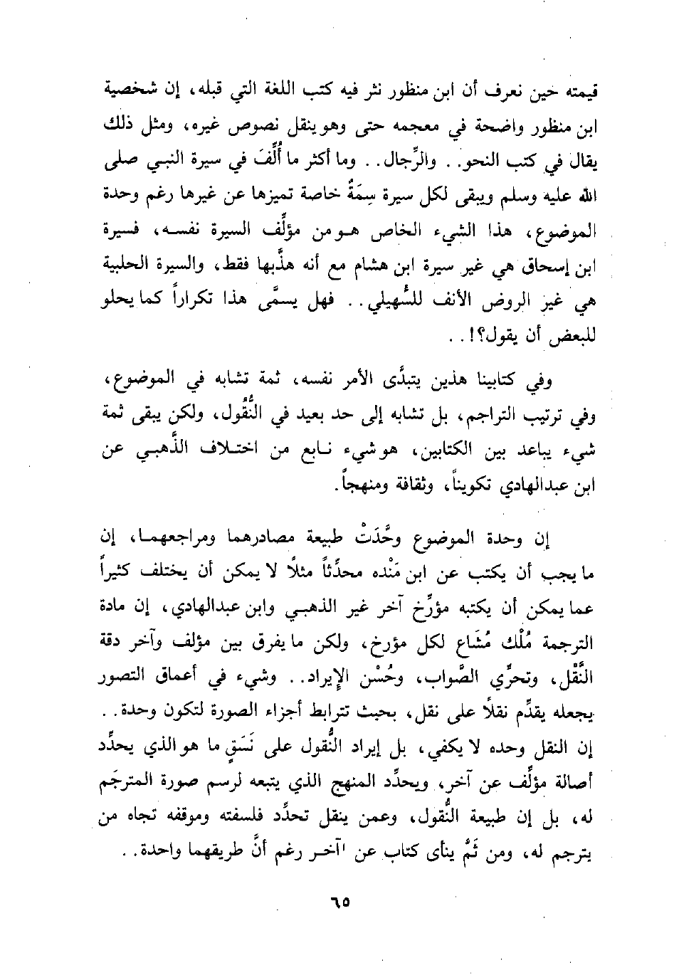 إن وحدة الموضوع وحَّدَتْ طبيعة مصادرهما ومراجعهما، إن ما يجب أن يكتب عن ابن مَنْده محدِّثًا مثلًا لا يمكن أن يختلف كثيرًا عما يمكن أن يكتبه مؤرِّخ آخر غير الذهبي وابن عبد الهادي، إن مادة الترجمة مُلْك مُشَاع لكل مؤرخ، ولكن ما يفرق بين مؤلف وآخر دقة النَّقْل، وتحرِّي الصَّواب، وحُسْن الإِيراد .. وشيء في أعماق التصور يجعله يقدِّم نقلًا على نقل، بحيث تترابط أجزاء الصورة لتكون وحدة .. إن النقل وحده لا يكفي، بل إيراد النُّقول على نَسَقٍ ما هو الذي يحدِّد أصالة مؤلِّف عن آخر، ويحدِّد المنهج الذي يتبعه لرسم صورة المترجَم له، بل إن طبيعة النُّقول، وعمن ينقل تحدِّد فلسفته وموقفه تجاه من يترجم له، ومن ثَمَّ ينأى كتاب عن آخر رغم أنَّ طريقهما واحدة ..