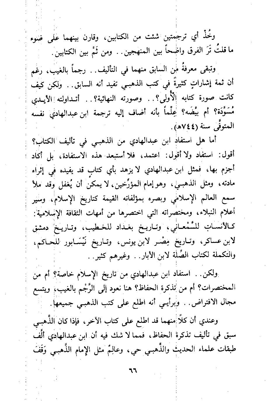 ولكن .. استفاد ابن عبد الهادي من تاريخ الإسلام خاصة؟ أم من المختصرات؟ أم من تذكرة الحفاظ؟ هنا نعود إلى الرَّجْم بالغيب، ويتسع مجال الافتراض .. وبرأيي أنه اطلع على كتب الذهبي جميعها.