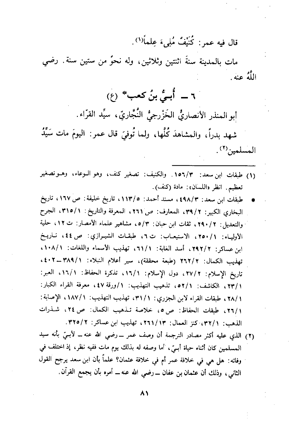 (¬2) الذي عليه أكثر مصادر الترجمة أن وصف عمر - رضي الله عنه - لأبيّ بأنه سيد المسلمين كان أثناء حياة أبيّ، أما وصفه له بذلك يوم مات ففيه نظر، إذ اختلف في وفاته: هل هي في خلافة عمر أم في خلافة عثمان؟ علمًا بأن ابن سعد يرجح القول الثاني، وذلك أن عثمان بن عفان - رضي الله عنه - أمره بأن يجمع القرآن.